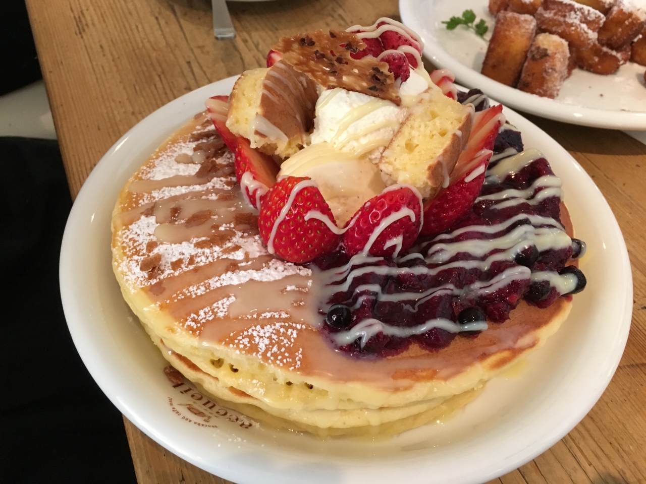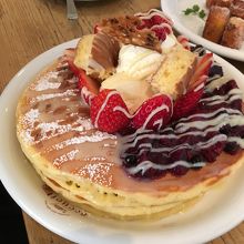 食べログ経由で予約。ネットで予約できるのは便利で助かります。特に休日は混むので事前の予約がオススメ。子供用のイスもあり、子連れでも安心。お子様メニューはありませんが、子供が好きなプライドポテトやパンケーキがあるので問題なさそうです。注文したのはかぼちゃのキッシュのランチセットにパンケーキはシェア。ランチを注文すると300円でシャンパンを追加できますが、人数がいたのでボトルで。パンケーキはやっぱりでかい…もちろん美味しいのですが、味よりもそのサイズの方が印象に残ります(笑)
