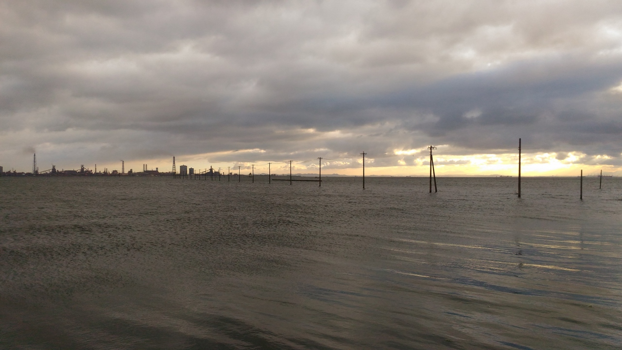 海面に連なって建つ電柱が、千と千尋の神隠しの電車が