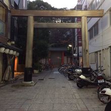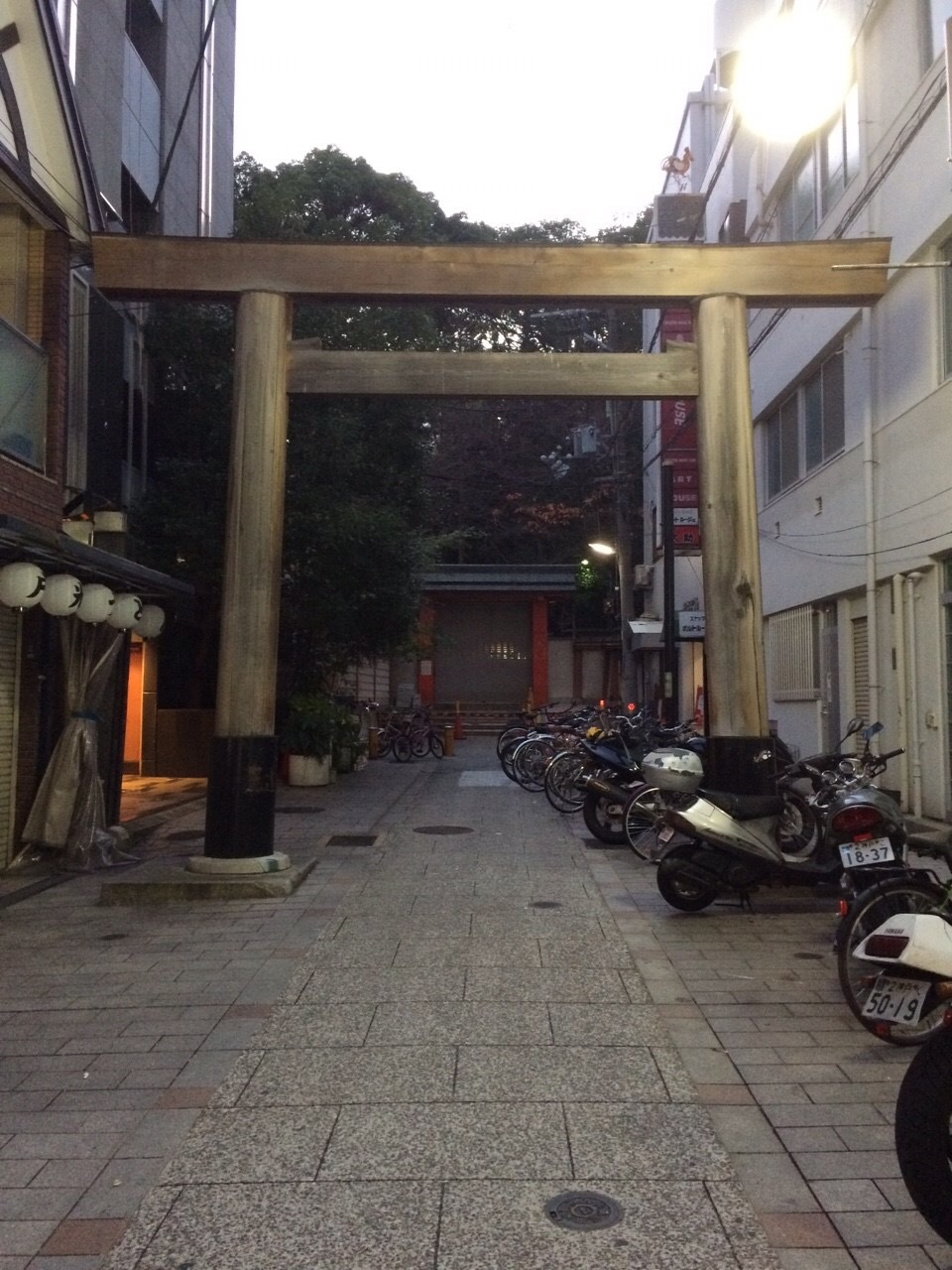 三宮から西に向かうとある東急ハンズ。そのすぐ前が生田神社。神戸を代表とする神社のひとつです。飲食店が多い、繁華街で有名ないくたロードは生田神社の参道。そして、東サイドにある東門街は夜の神戸の繁華街。飲み屋さんがたくさんある不夜城。その東門街にも色のない鳥居があって実にシックです。