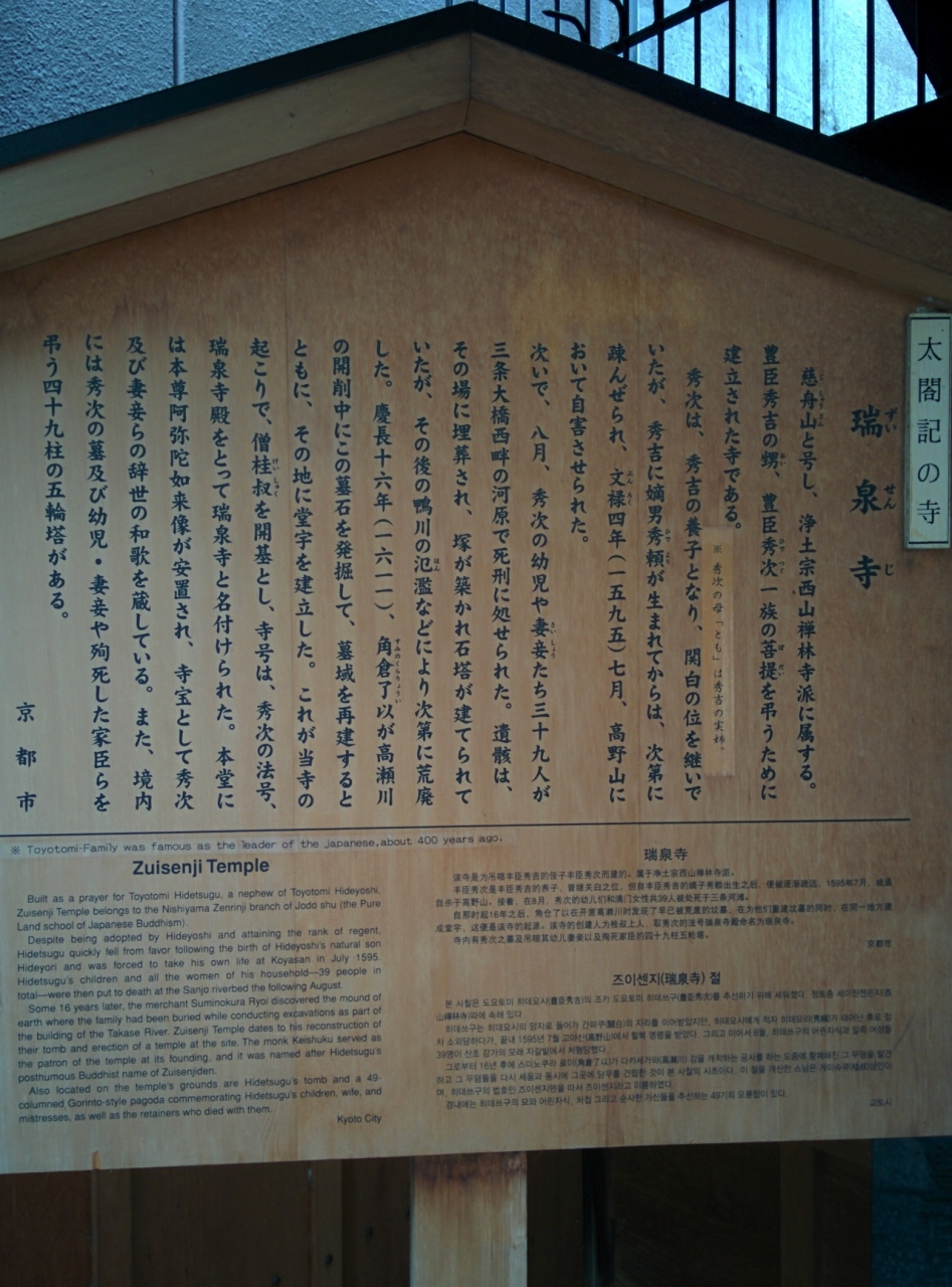 その後、高瀬川を開拓した角倉了以が処刑された豊臣秀次の妻妾、子供らの遺骨を「瑞泉寺」で供養し現在に至っているようです。