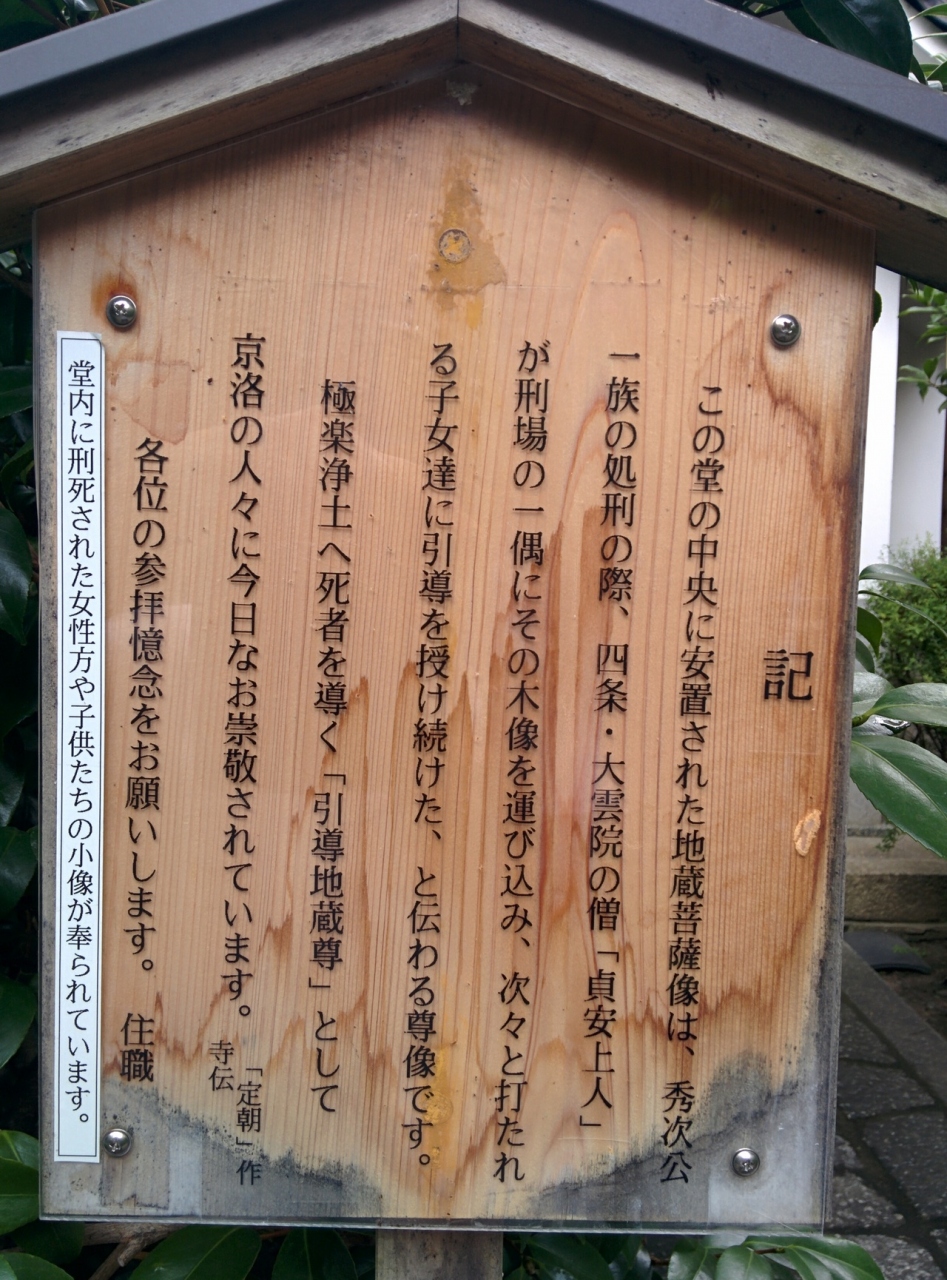その昔、お寺さん近くの三条大橋が架かる鴨川河川敷で豊臣秀次の妻妾、子供らが豊臣秀吉の命により処刑され、河川敷に埋められたそうです。