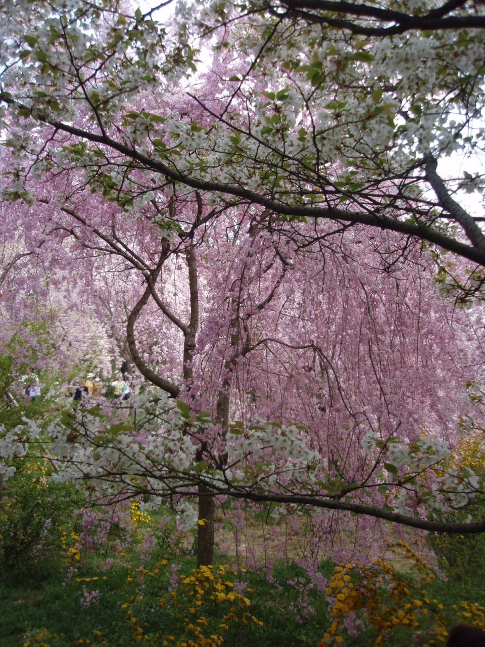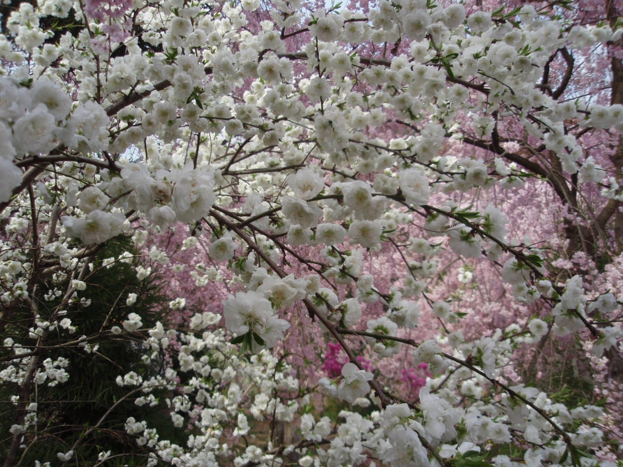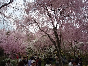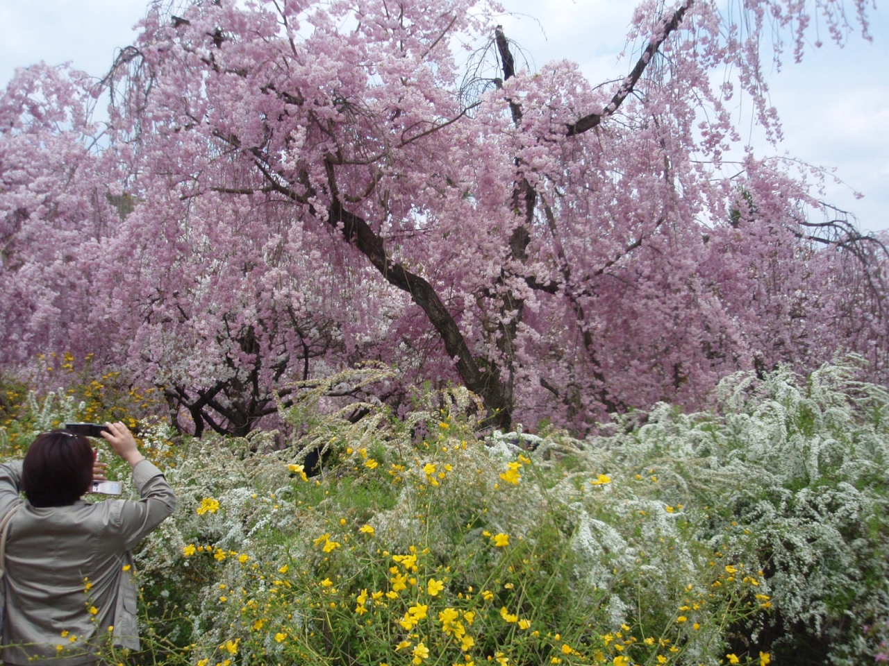 4000坪の苑内に二十数種類の桜(枝垂れ桜、大島桜、御衣黄黄桜、御衣黄緑桜等)が満開で、あまりの美しさに千数百円の入園料が高価と感じさせない風景である。ソメイヨシノの桜の名所は全国に多くあるが、どの名所もこれに勝るところは無いように思えるほどである。桜以外にゆきやなぎ、ぼけ、吉野つつじ、れんぎょう、かいどう、山吹(黄、白)、石楠花が満開で見られた。ただウイークデーにもかかわらず、人の多さにはびっくりする。足に自信のある人は仁和寺の御室桜を見て徒歩で原谷苑により、金閣寺まで足を延ばすルートもありますよ。