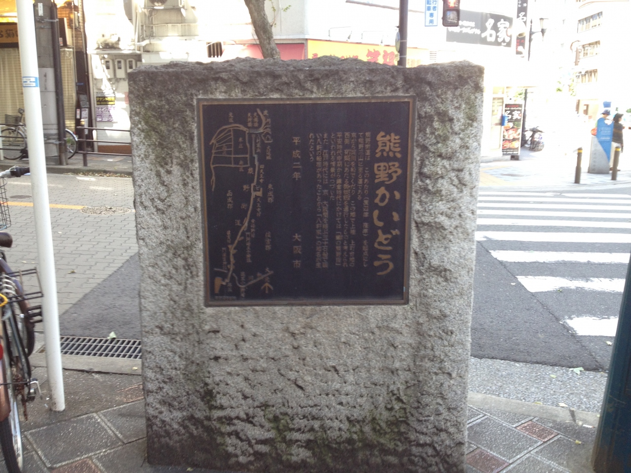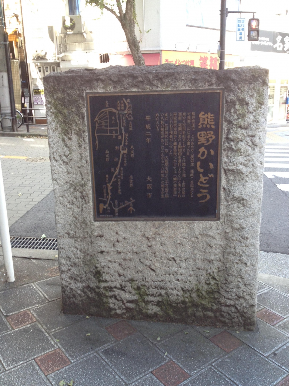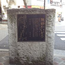 淀川、大川を経て、天満橋はちげんや船着き場から陸地に入り、熊野三山まで街道を南下するという経路のようです、起点は正確にはわからず、この付近がおぞらく起点だったという石碑で碑は平成になって建てられたものです。土佐堀通と御祓筋の交差点、天満橋交差点からはやや西側の市バスが出てくる場所にあり、草もなく目立つ石碑でした。