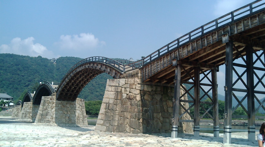 昔はただスタスタと歩いて渡ったと思うのですが、入場料が必要になっていました。橋もなんとなくきれいな感じです。説明をよく読むと、台風の影響で流され、架け替えをした部分がるようです。すぐは渡らず、河原に降りて曲線の観察。詳しくは覚えていませんが、昔と変わらない美しいアーチを描いた曲線です。歩くだけでなく、いろいろな角度からその姿を見てみるのも良いと思います。