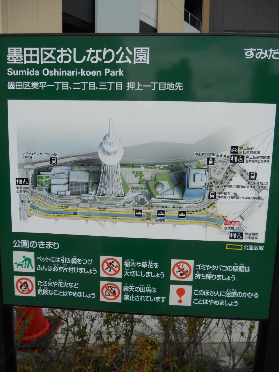 「おしなり公園」は、「東京スカイツリー」のすぐ南側、「北十間川」沿いにある公園で、遊歩道はもちろん、芝生やスロープなど、整備が整っている、とても綺麗な公園でした。