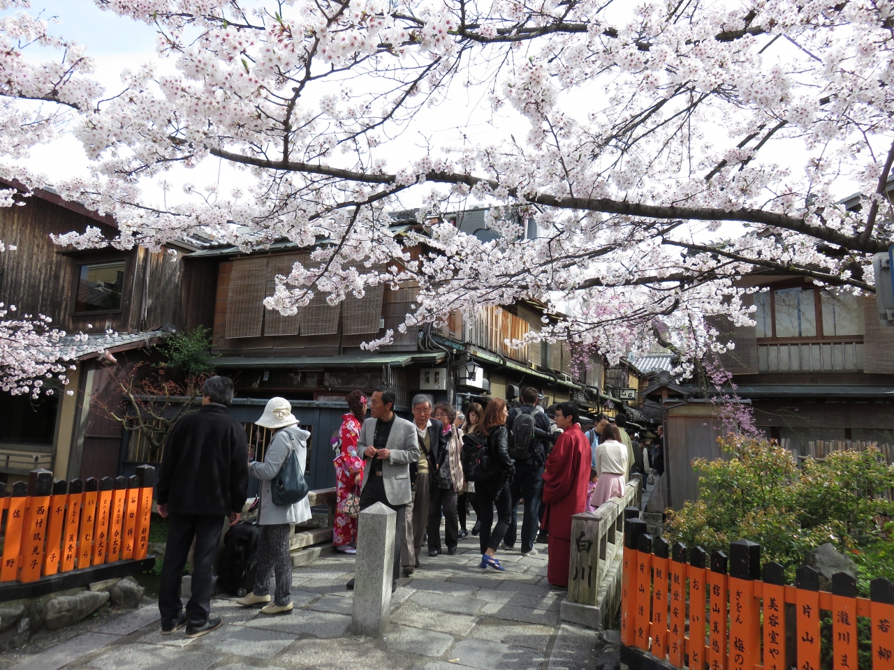 東山の観光スポットで超人気の場所の一つ。このところ外国人も多く訪れるようで、割合は日本人より多いかも。写真撮影のスポットの一つでもあるのだが、いつも人がいて橋だけの写真がなかなか撮れない。今日も人がいっぱいで橋が落ちないか心配に。