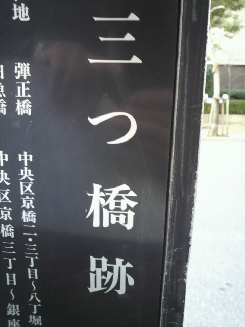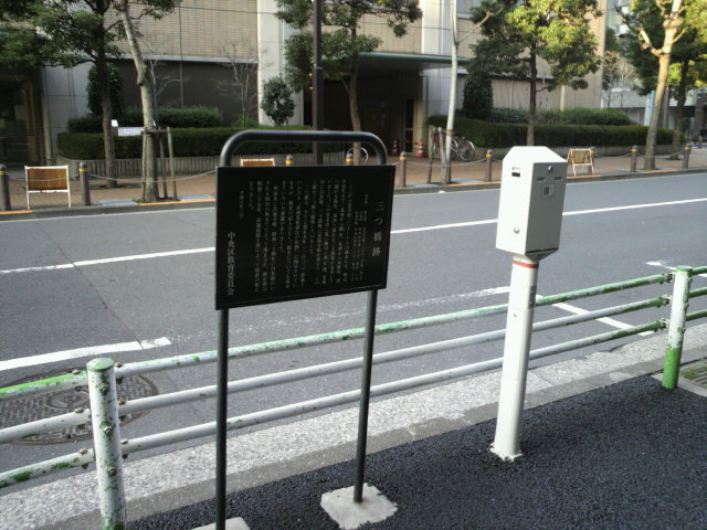 三ツ橋の標識は、中央区の施設も入っている京橋プラザの建物の向かいに残されています。