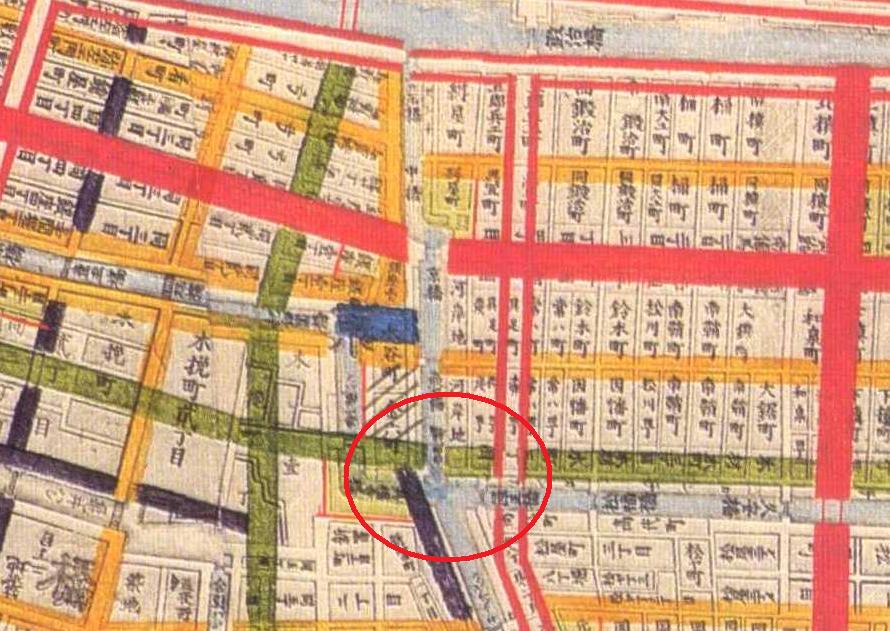 江戸時代に、楓川、京橋川そして三十三間堀が合流していた付近に、楓川に弾正橋、京橋川に白魚橋及び三十間堀に真福寺橋の各橋が架かっていて、総称して三ツ橋と言われていました。
