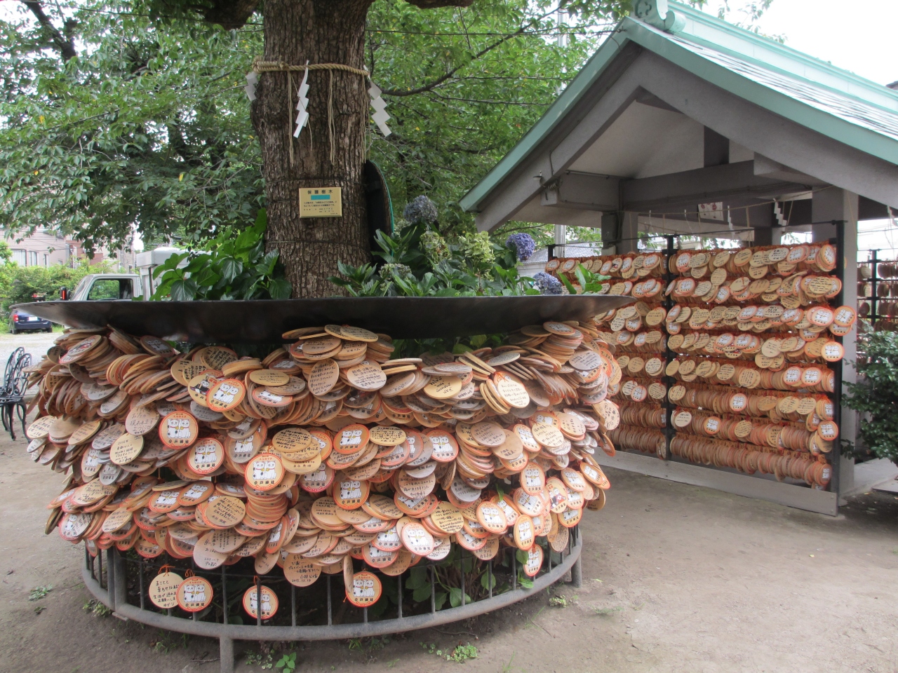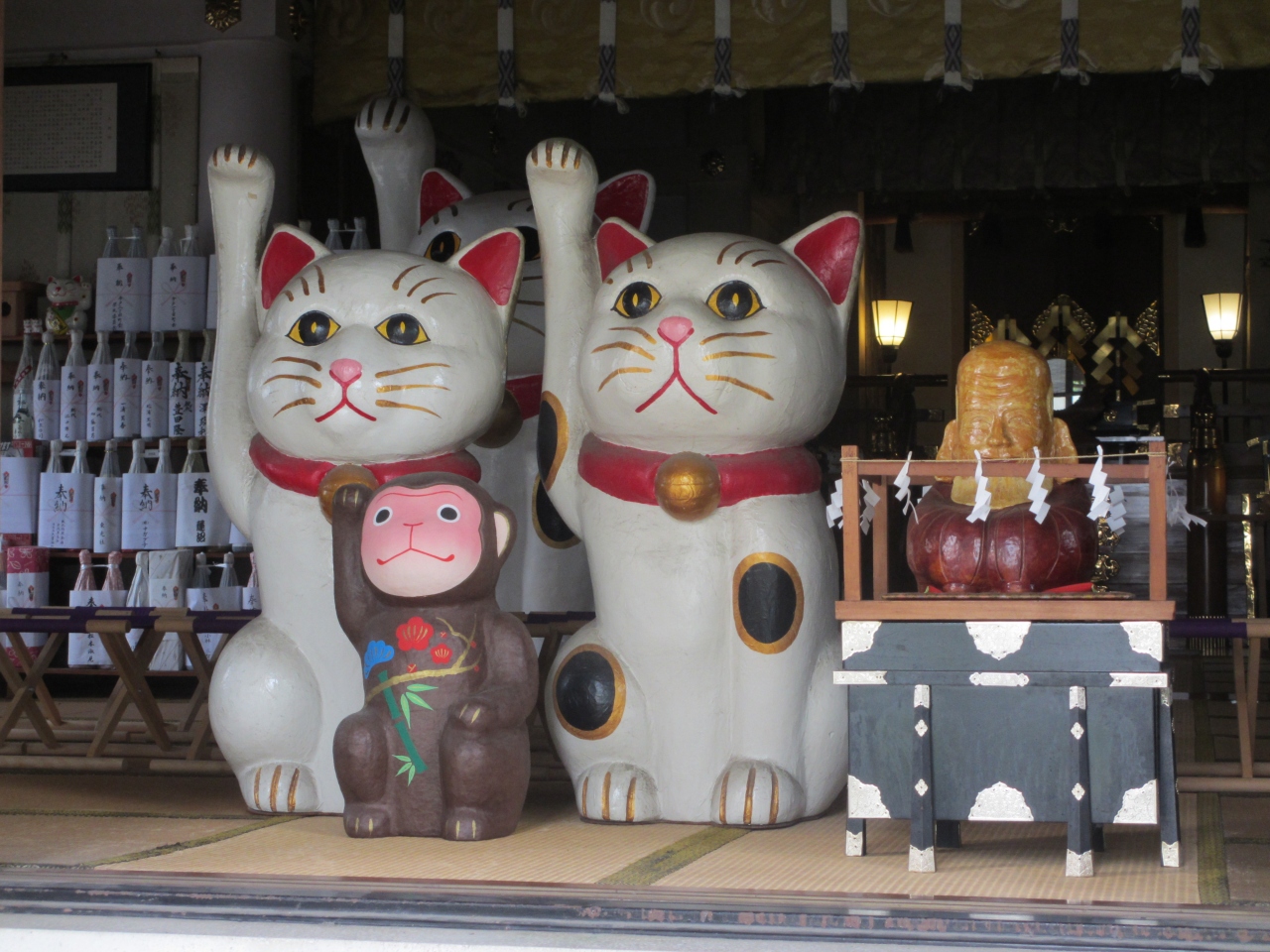 都立浅草高校のそばにある神社です。鳥居をくぐると、招き猫発祥の地と沖田総司終焉の地の看板があります。拝殿の大きな招き猫が迎えてくれます。恋愛成就を祈願する人が多く、絵馬がたくさんかかっていました。白や黒い猫のじょうろが並べてあるのも可愛らしく、特色ある神社です。