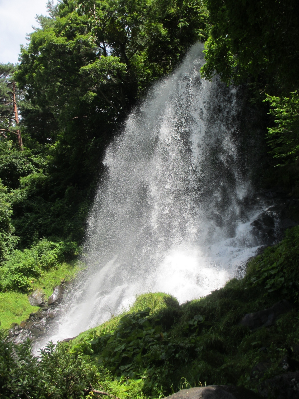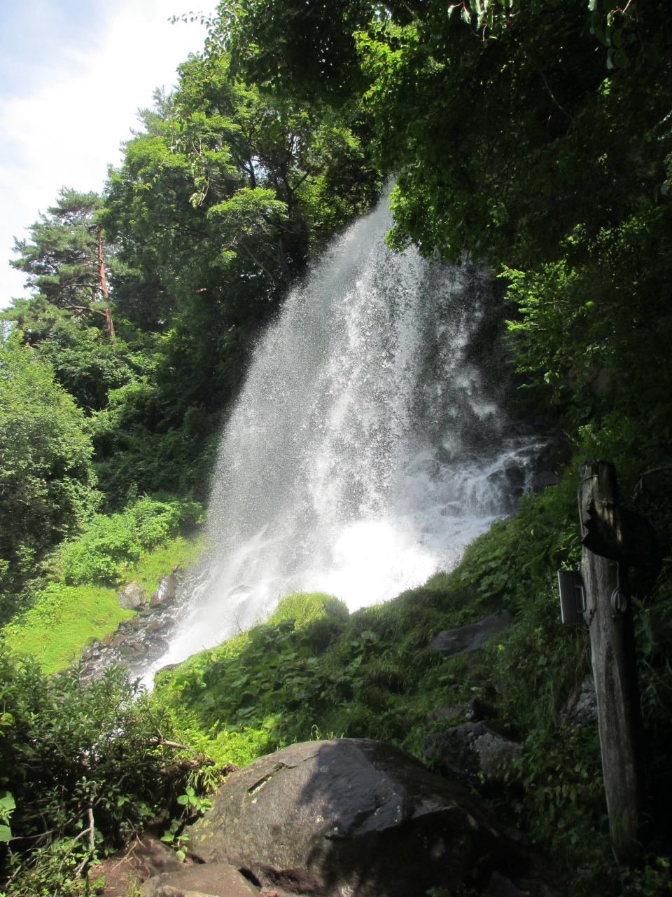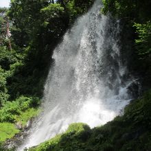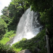 横谷渓谷遊歩道の入口にある滝です。木戸口神社の脇を流れる小川が渓谷に流れ落ちています。マイナスイオンが多く計測されています。旅番組に取り上げられる横谷渓谷の観光名所で滝つぼの横から眺めることができます。訪れた前日に大雨が降ったので滝のしぶきが道に降りかかっていました。