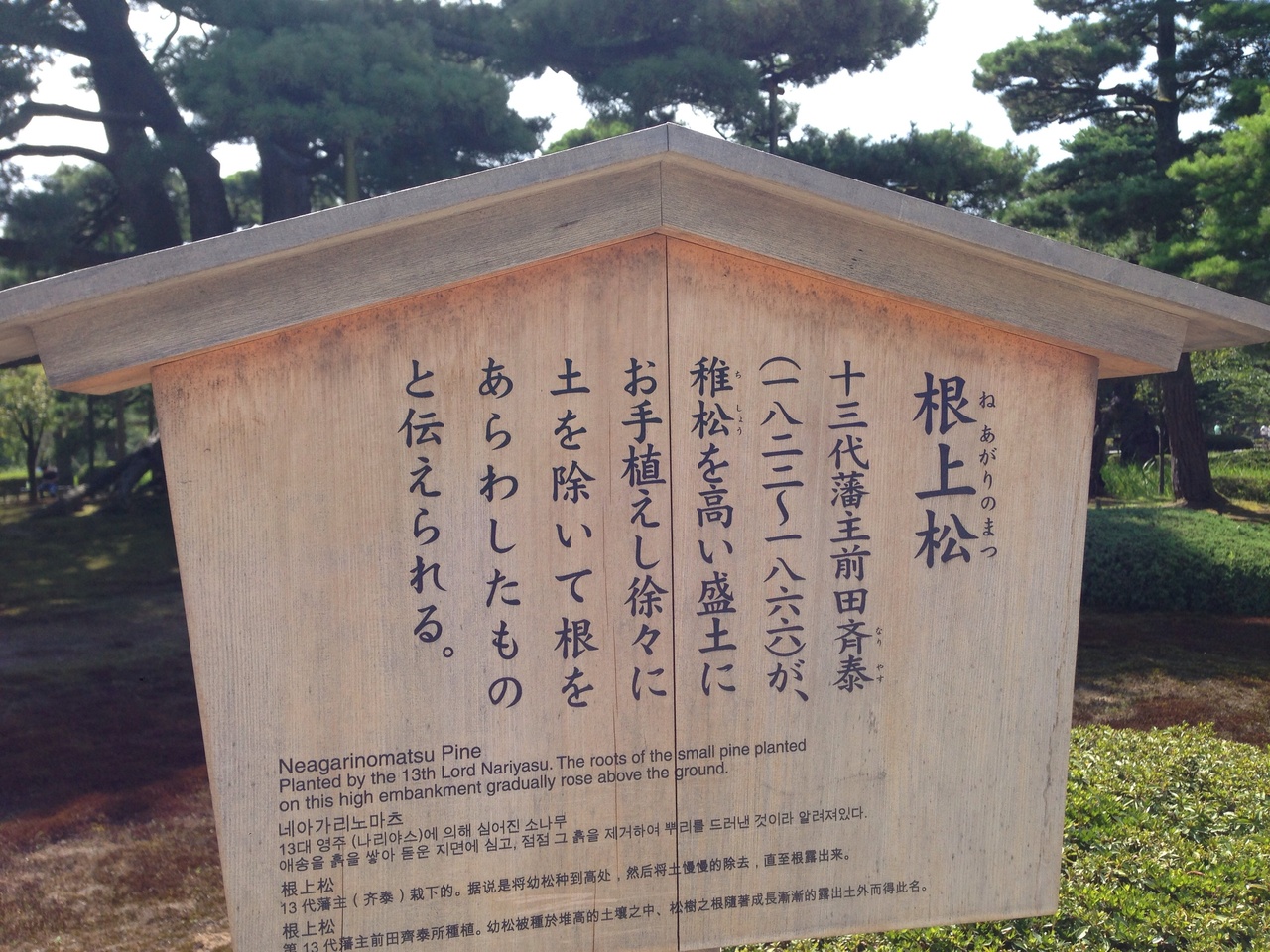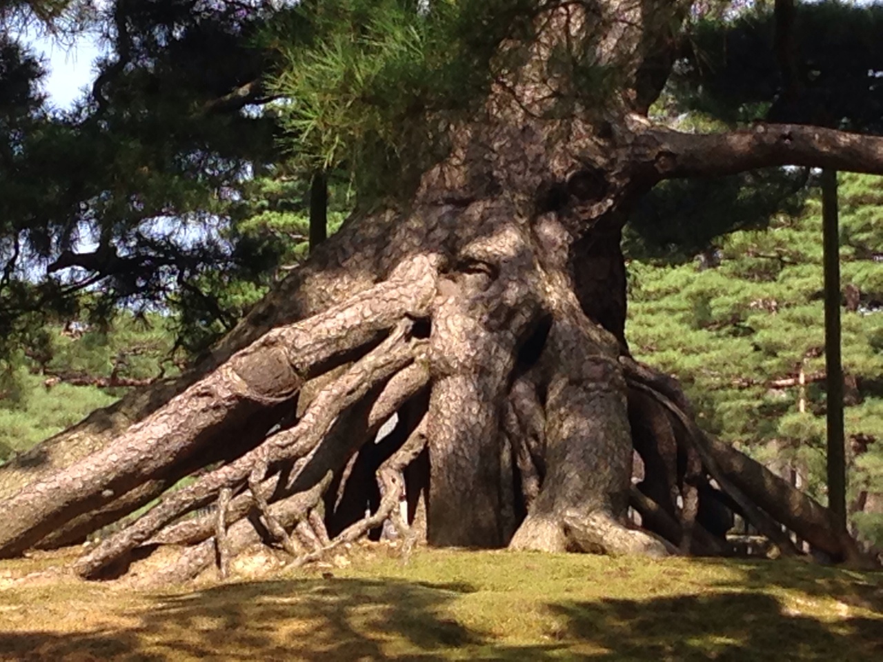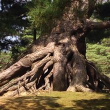 園内には多くの松の木があります。こちらはその中でもひときわ立派なもの、とにかく大きく360度あらゆる角度から眺めたくなります。枝も四方に広がっており、支えている木自体も太いことからこの木の大きさをより感じます。