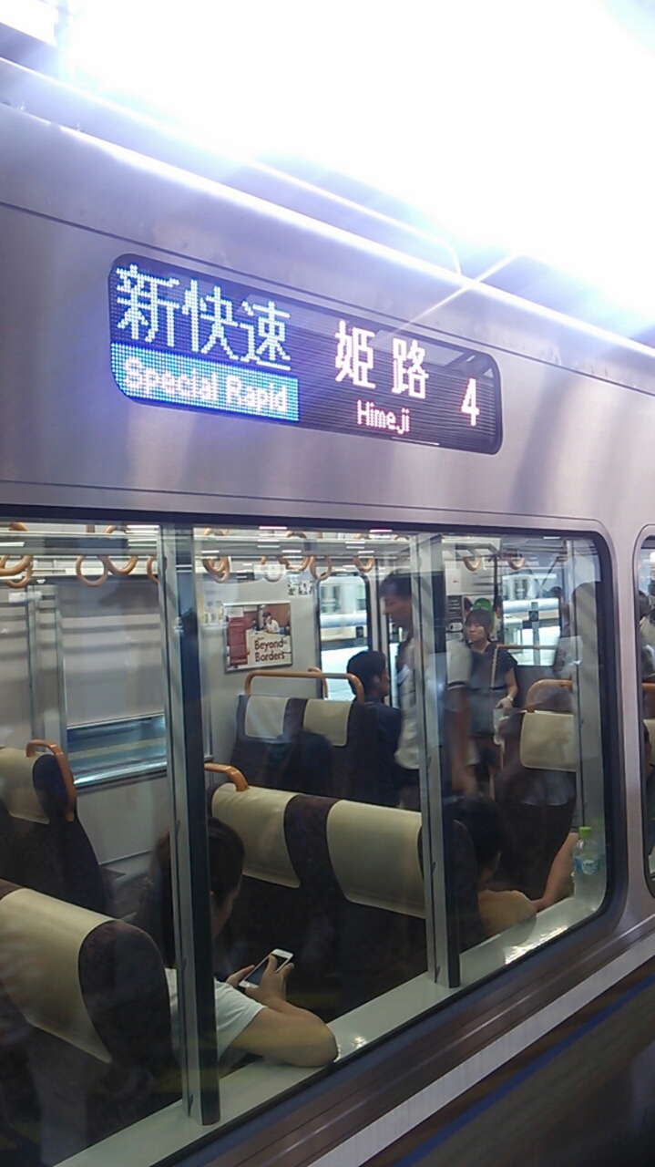 この新快速ですが、座席の一部に2人掛け転換式クロスシートが装備された223系という車両が中心に使われていますが、2016年8月13日の土曜日、大阪12時00分発新快速姫路行きを利用したところ、225系という新型車両に乗ることが出来ました。