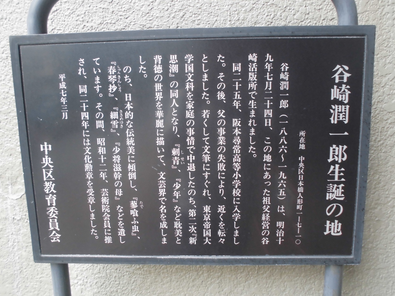 明治の文豪である谷崎潤一郎。その谷崎が生まれたがあった場所です。とはいえ当時の生家が残っているわけではなく、標識だけがその様子を伝えています。何もないので熱烈なファンでなければわざわざ行く必要はないと思います。