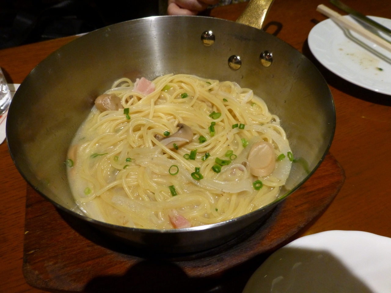 ちょっと遅く21時ころに夕食を食べられるお店を探し始めました.居酒屋さんはタバコが苦手なので避けましたので,禁煙席のあるこちらのお店にしました.メニューもビールのおつまみというわでではなく,がっつり食べられるものなのでうれしかったです.また,ムール貝のワイン蒸しの残ったスープでスープパスタを作ってもらえます.この時はビールを飲んでちょっと大きめの声で話すグループもいらっしゃいましたが,こればっかりはめぐりあわせですね.
