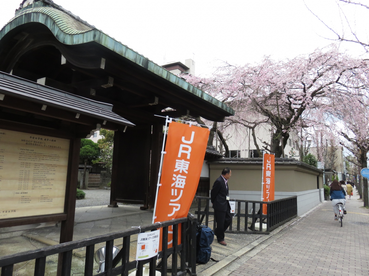 京都御所の西、烏丸通り沿いにある大邸宅が有栖川宮邸跡です。現在は平安女学院の所有だそうですが、年に数回有料で公開されます。この日は「そうだ、京都行こう」のJR東海のツアーのみに公開されていました。何とも桜が見事で、歩道にせり出していました。