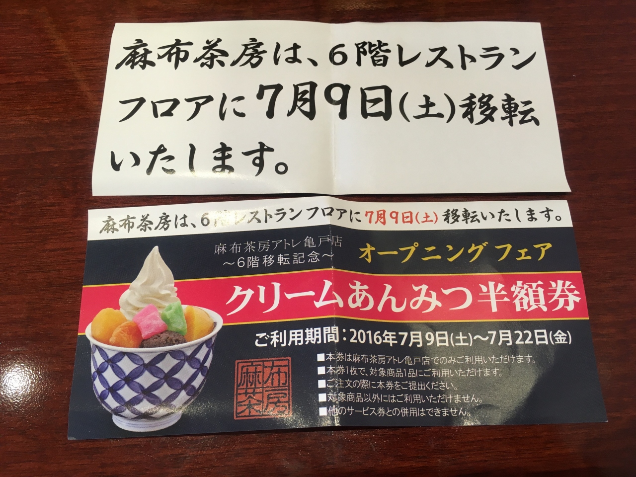 移転前、家族と食べに行った時に、オープニングフェアで使えるクリームあんみつ半額券をもらったので、利用しました。