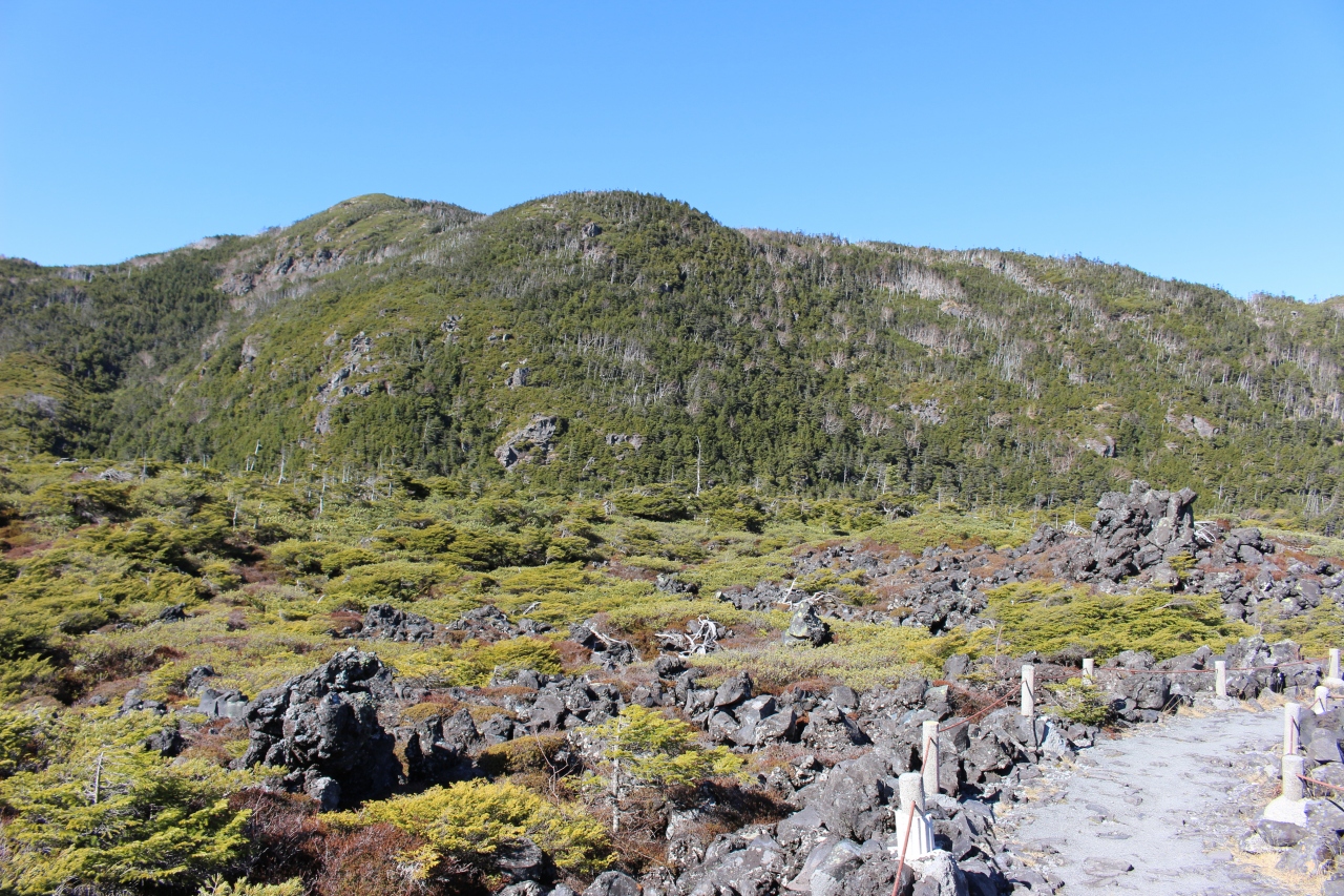火山の噴火で固まった岩場が広がっており、かなりのゴツゴツですが周囲を散策できます。紅葉時期に行きましたが、景観的には、紅葉もなく特にこれといったものはなかったです。