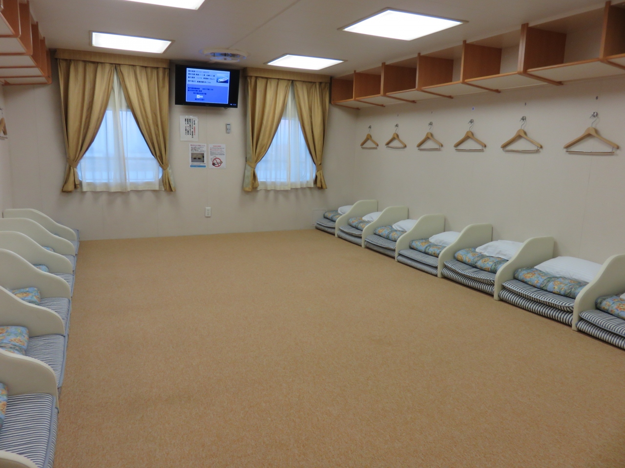 鹿児島行のきりしまは古い船体です。レディースのツーリストルーム(大部屋)は22人部屋で枕もとに収納棚あり。キャリーも置けます。