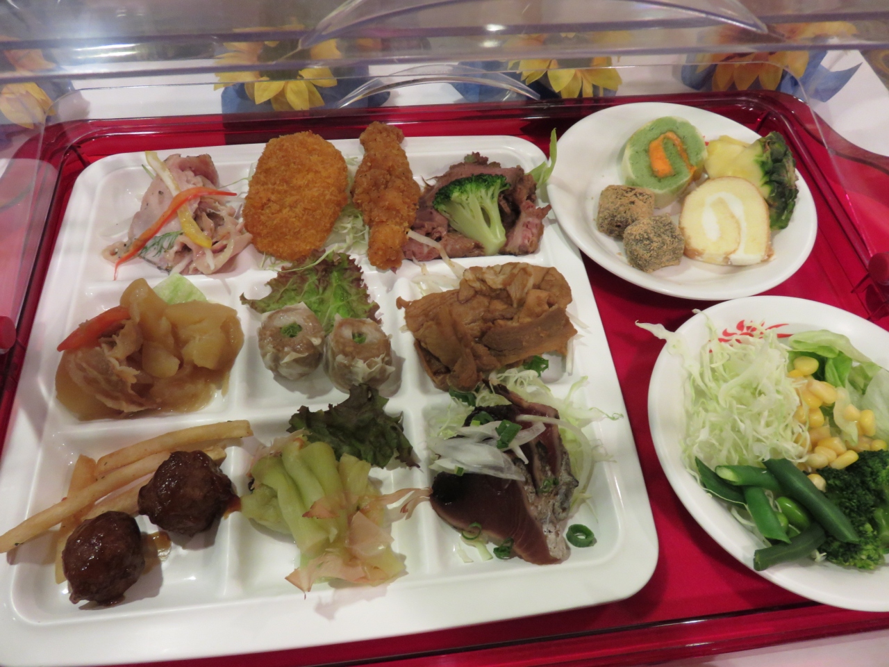 ・夕食のバイキング1540円(ソフトドリンクバー付)。レストランも大行列でお風呂とどちらを優先するか。満室なので特別に弁当が1000円で販売されていた。