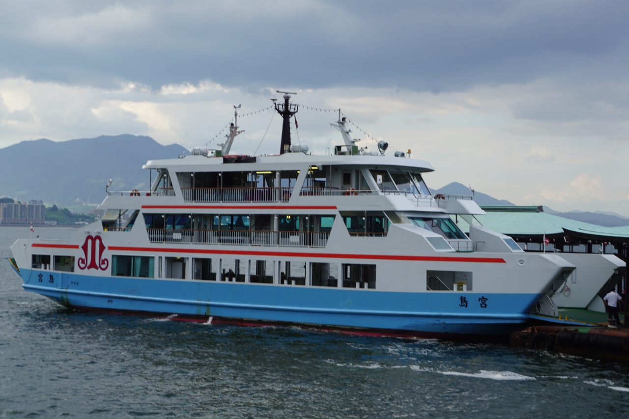 宮島桟橋は、JR西日本宮島フェリーと宮島松大汽船が宮島口との間を15分間隔で運行しています。いつでもぞろぞろ続く長い行列ができていて、ちょっと疲れます。なお、広島市内の原爆ドーム行きの直行便もあるんですが、往復料金で3,600円。ちょっとお高めです。