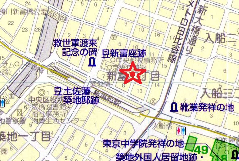 新富座のあった周辺には、歌舞伎関係の人々が多く住み、新富稲荷神社は、新富町の鎮守の役割を担っていたとのことです。