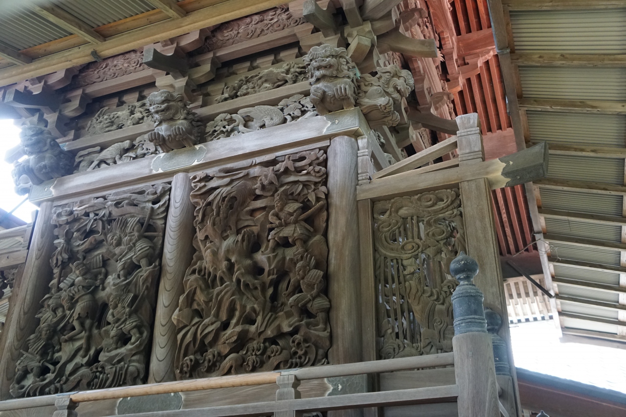 境内には神楽殿もあって、往時の隆盛も偲ばれます。ただ、見所の一番は本殿の彫刻。裏に回って拝見しましたが、「昇り龍・下り龍・獅子(阿形と吽形)・鳳凰・天邪鬼・鷹・松に、稲作の様子を田起こしより収穫まで描いた四季農耕の彫刻」と紹介されている彫り物は確かに見事。一見の価値ありです。
