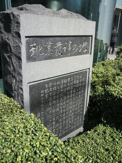 靴業発祥の地の碑が、入船橋交差点の東側に置かれています。