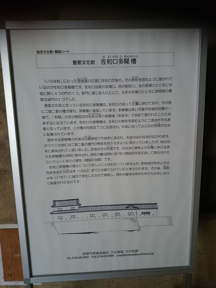 いろは松の通りを彦根城に向かって歩くと、左手に二の丸佐和口多聞櫓があります。右手の建物は開国記念館です。「入場無料、公開中」の文字が目に留まり、早速階段を上り見学をしてきました。城門の形式としては最強の枡形で重厚な造りになっています。