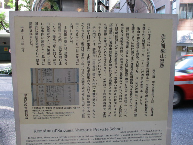 東京メトロ日比谷線東銀座駅改札出口から昭和通りと晴海通りの交差点渡りぐんまちゃん家の先に進み、みゆき通りを築地方面に向かってすぐ右手に佐久間象山塾跡説明板が立っています。佐久間象山私塾の門下には勝海舟、吉田松陰など有能な人材が育ったことは有名ですが、今は説明板が立っているだけで何の面影もないのが残念です~
