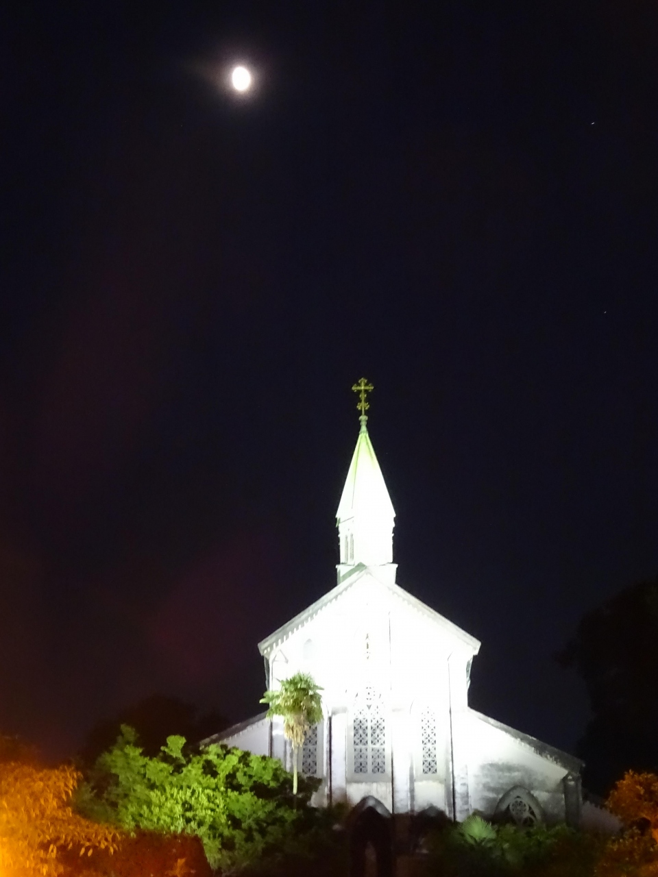 夜間ライトアップされていますが、この時間帯はもちろん中には入れません。坂を上ったところにありますが、夜間は参道の坂道の土産物店等も閉まってしまいます。夜間の観光客は殆どいませんでした。月の光とライトアップされ白く浮き上がった教会は神秘的です。