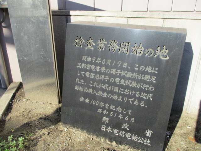 新橋駅から歩いて15分くらい昭和通りから海岸通りへと続く高速道路下のカレッタ汐留の海岸通りを挟んで向かい側にある銀座郵便局の敷地内に検査業務開始の地の石碑はあります。碑には明治9年6月17日、この地に 工部省電信寮の碍子試験所が発足して電信用碍子の電気試験が行われた。これが我が国における近代的物品購入検査の始まりである。と~電信品質確認の基礎がスタートした地です~残念ながら石碑のみですが新橋・銀座の観光で立ち寄って観ては如何でしょうか~