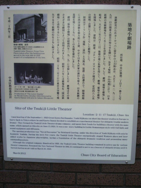 築地小劇場跡の標識が、地下鉄築地駅の北側の小路にあります。