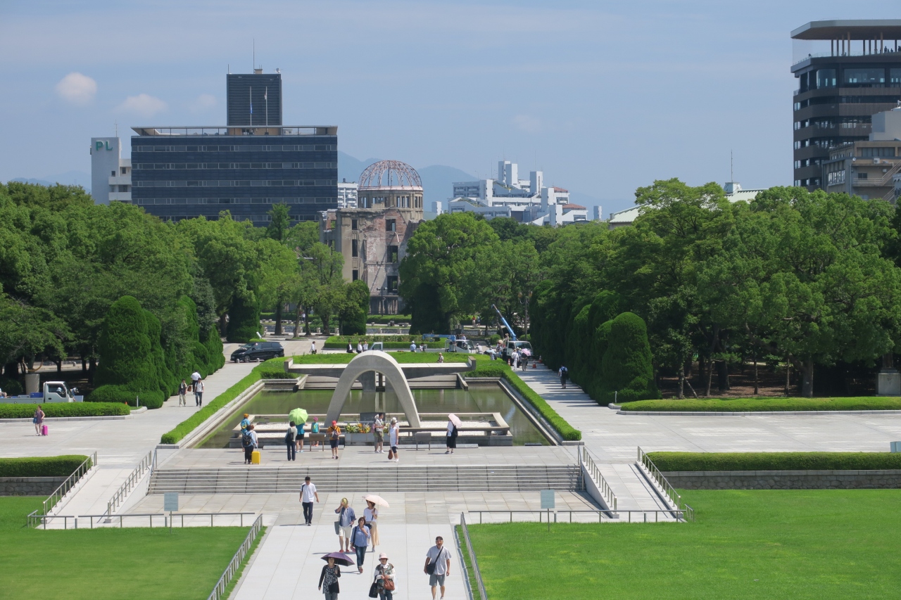 建造時によく考えられて設計されており、慰霊碑の遥か遠くに原爆ドームが見えます。