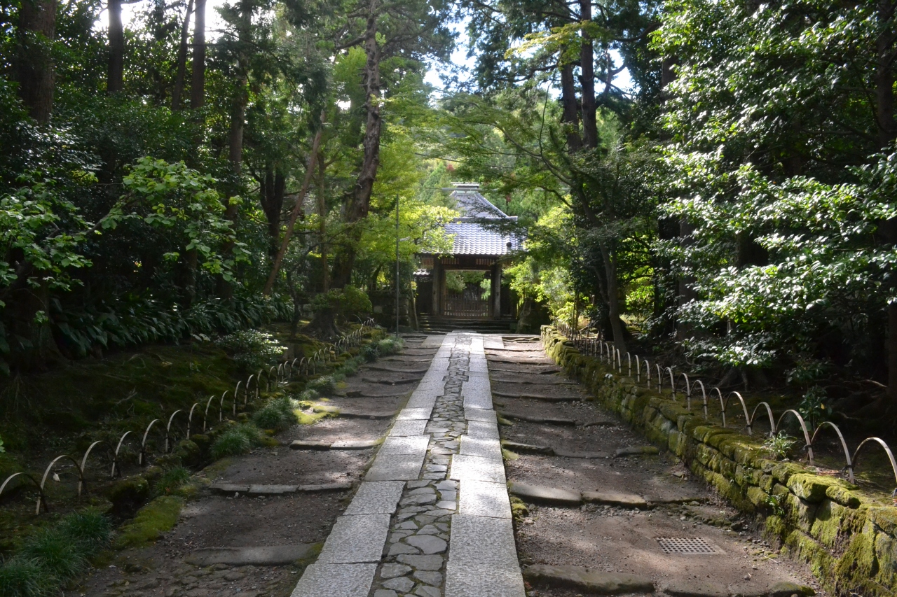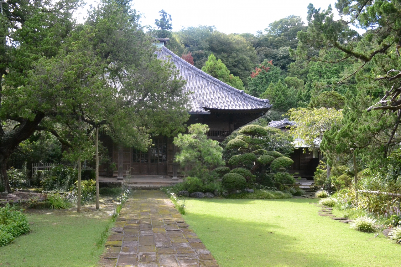 北鎌倉駅から鎌倉駅に行くときに、右側に見えるお寺です。