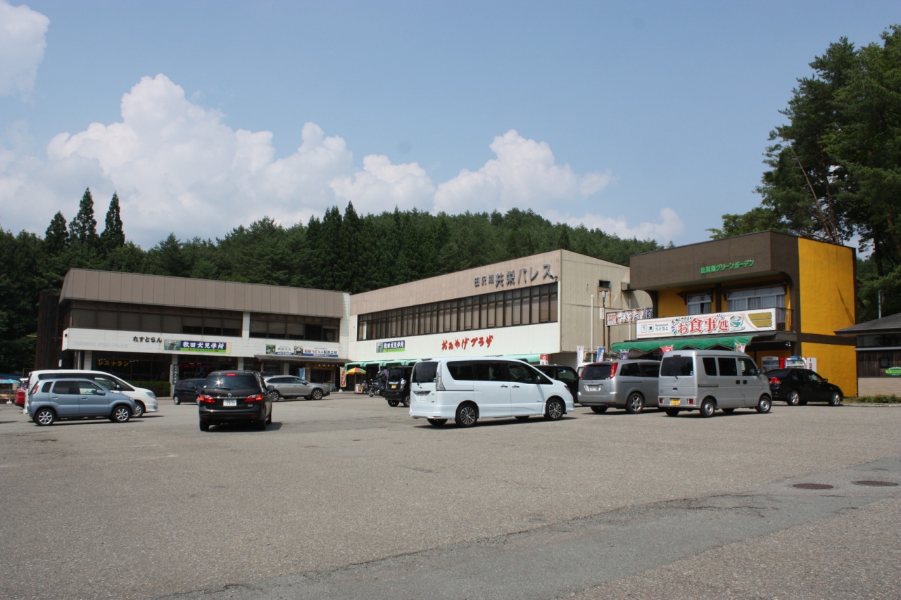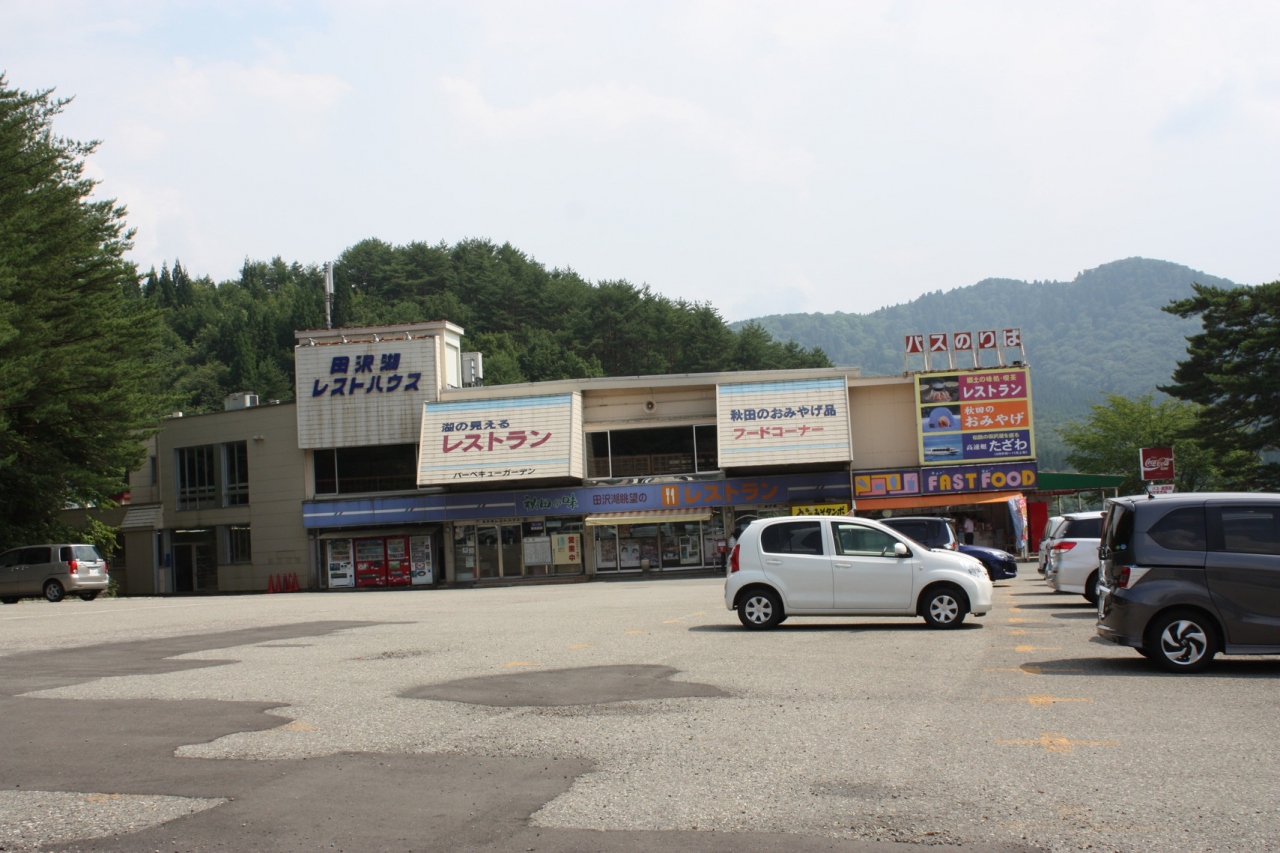 田沢湖の入ってすぐの大きな駐車場が有ります。駐車場には2つの建物が離れて存在します。手前側が「秋田犬と比内地鶏」がいる「おみやげプラザ」離れてバスセンターや遊覧船のチケット売り場が有る方が田沢湖レストハウスのようです。秋田犬を見ると、「プラザで土産を買ってね」と看板が有るのですが、品揃えが少ないのでレストハウスへ行って購入してしまいました。2階にレストランも有るようで利用する人が多いみたいです。