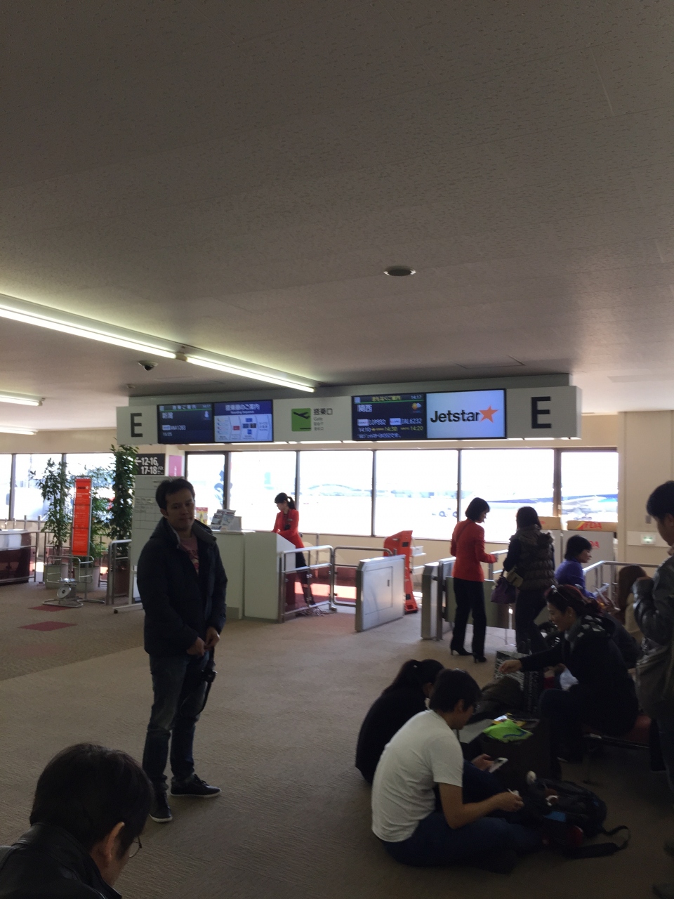 セキュリティー通過後に渡される?緑色の札?。なんなのかわからないまま搭乗口へと向かうと、どうやら搭乗ゲートを示す札のようでした。結構前から拡張工事が行われているものの、その完成は2020年度とのこと…。気が遠くなるようなペースで行われています。こじんまりとした地方空港がどのようにかわるのかは是非とも見てみたい気がします!