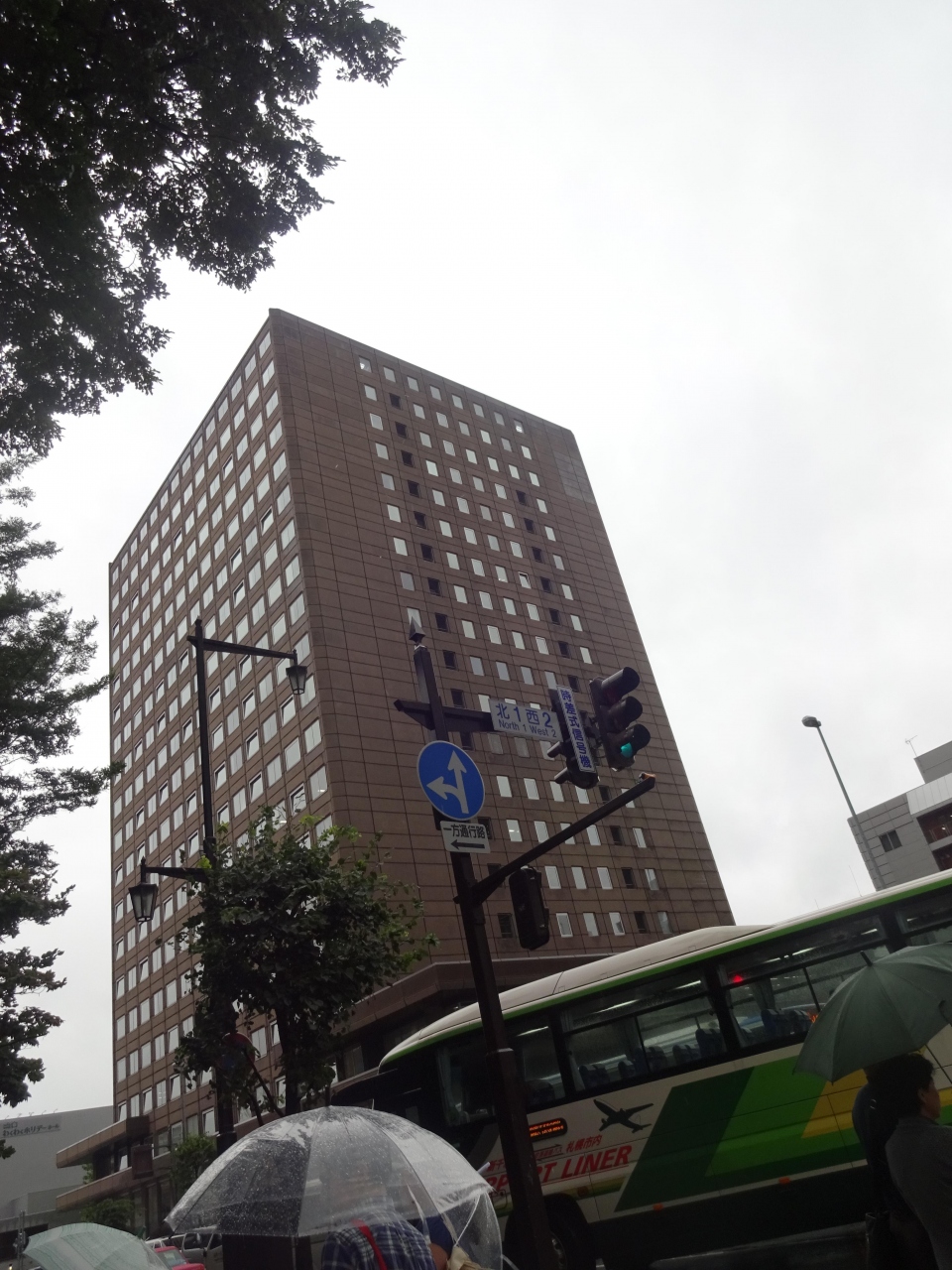 通りを挟んで時計台と向き合う位置にある高いビルが市役所。