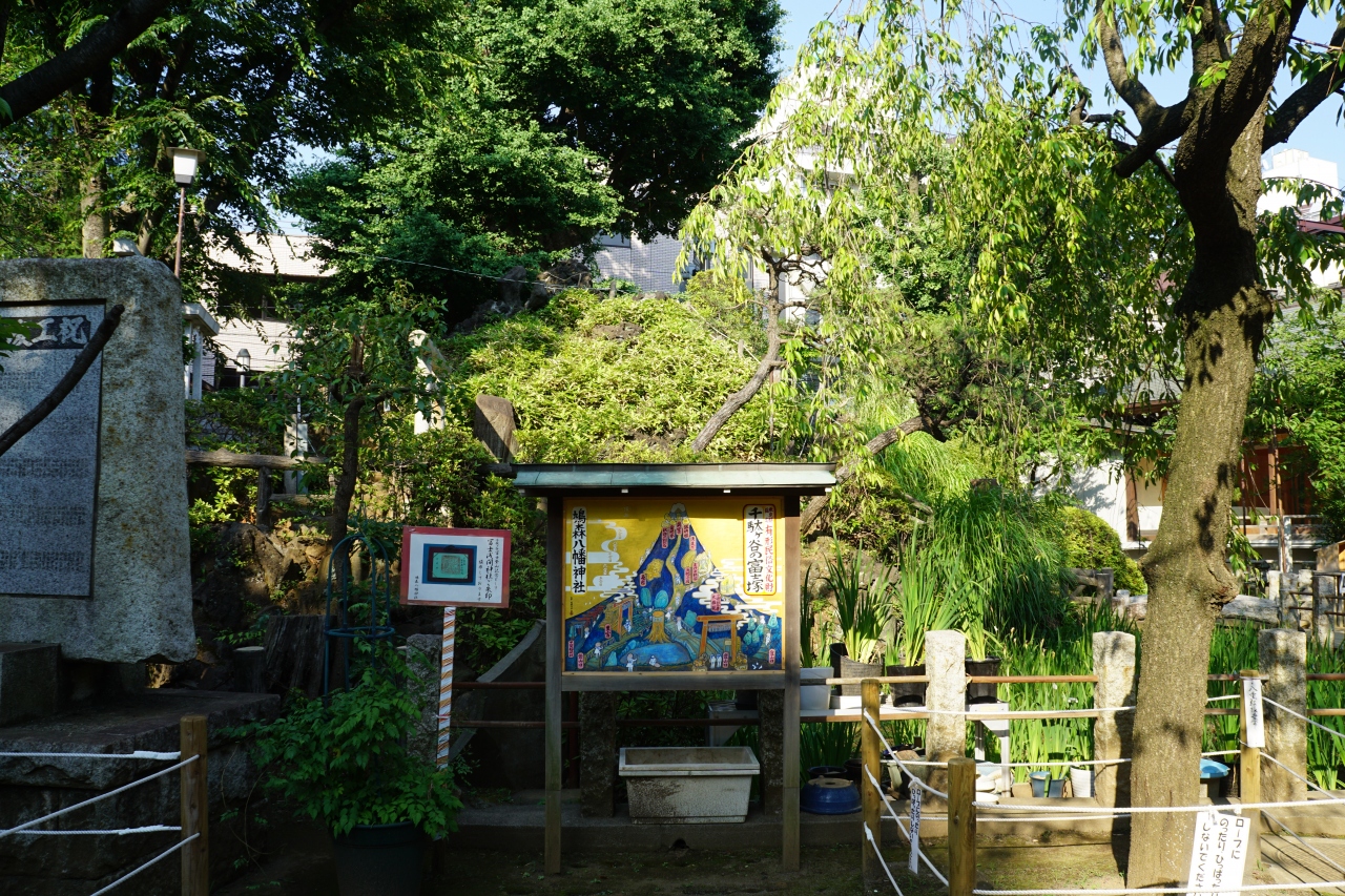 千駄ヶ谷の鳩森八幡神社にある富士塚は、江戸時代、千駄ヶ谷富士と呼ばれ、市中の有名な富士塚である江戸八富士の一つでもあったとか。こんもりした景色をバックに、何んとも風情ある富士塚の案内板が立っていて、これも見どころかなと思います。