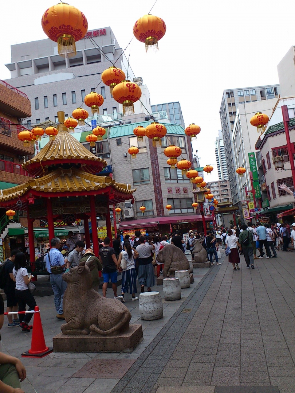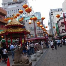 神戸の中華街の南京町の真ん中にある広場です。広場の真ん中に東屋風の小さな建物があります。その周りには赤や黄色の提灯がぶら下がっていて、いかにも中国風の雰囲気が漂っています。土曜日のお昼頃に訪れたので、ものすごい人出で、通りもそうですが、この広場を歩くのも人を掻き分けて前に進まなければならないほどでした。