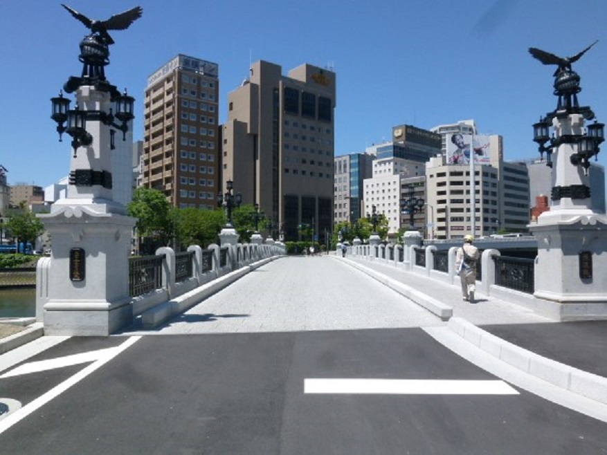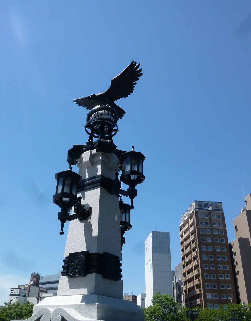今日は広島を散策しています。平和記念公園方面に行くのですがその前に先日TVで紹介していたのを思い出して「猿猴橋」に立ち寄りました。広島駅南口より大通りを真っ直ぐに、数分で駅前大橋がありますがその左手にあります、カッコいい橋なので直ぐわかると思います。猿猴橋は大正15年(1926年)に架けられましたが、シンボルである地球儀と鷲の像は戦時中の金属類回収令により撤去されました。しかしその後その姿は再現され美しい橋として生まれ変わっています。橋の横に立っている説明文には大正当時の姿が表現されています。是非立ち寄ってくださいね。