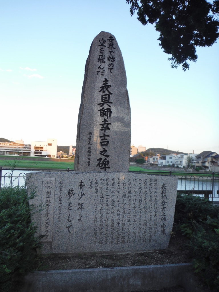 なんとなくレトロな、懐かしい風景の路面電車の走る京橋。その京橋のたもとに元祖鳥人間の浮田幸吉の碑があります。玉野市の八浜出身で京橋でも飛行したようです。碑のまわりは綺麗に舗装され、花が植えられた遊歩道になっていてランニングや散歩をされている方をよく見かけます。