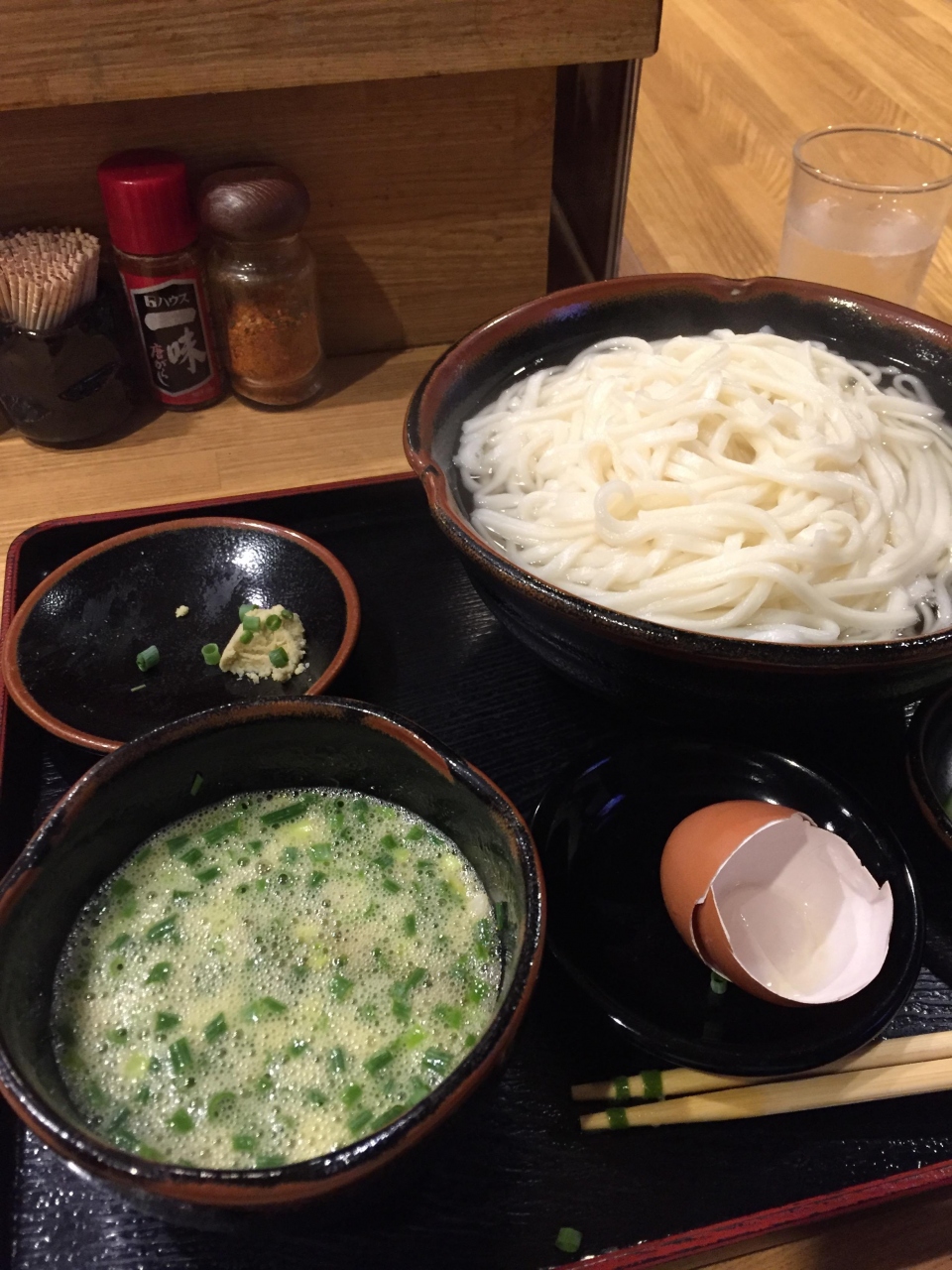 釜揚げうどんのお店です。飲んだ後の締めで食べると、(ラーメンより)胃に優しく感じますし、食事として食べても満足できる味(結局、その後に飲みたくなるけど)。食べ方はお店の方が教えてくれます。麺がゆであがる前に「卵を割って、薬味を入れてよく混ぜて下さい」と準備するように言われます。とっくりに入ったあつあつのつけ汁も出てくるので、それをかけて、うどんを投入。かまたまのようにも思うし、とりあえず美味しいので一度は召し上がられることをオススメします。