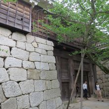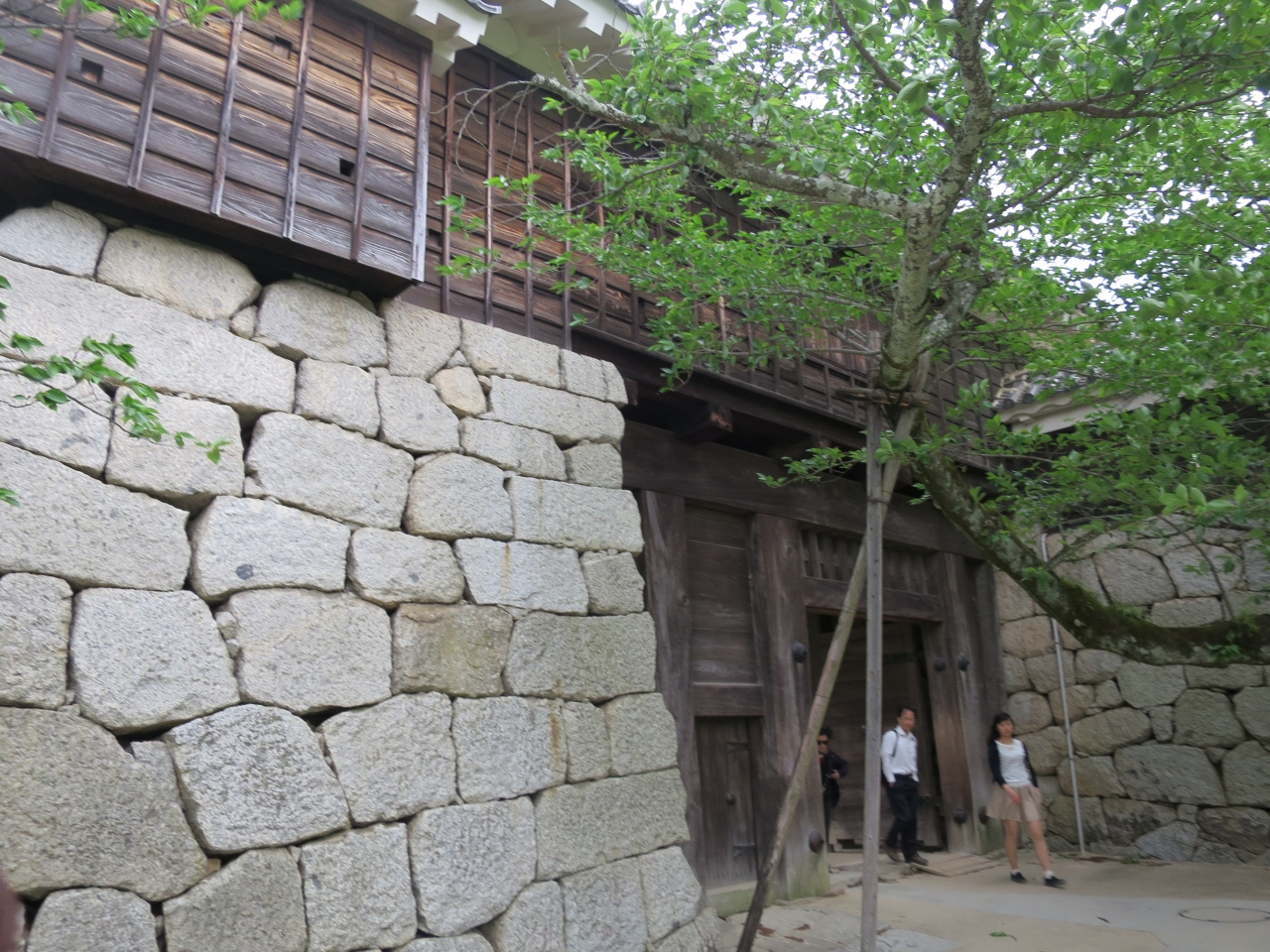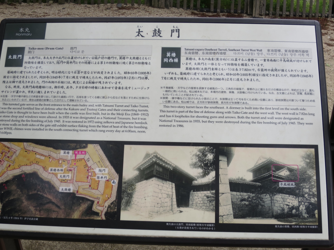 ロープウェイ駅から松山城天守に向かって上っていくと戸無門、筒井門または隠門を抜けると、その次に太鼓門が現れます。太鼓門の内と外は雰囲気が異なります。この門を抜けると本丸なので、外側は普通の門、内側は石垣間を埋め崩せ、通路を潰せる作りになっており、正に本丸の入口と言える正門で軍事的な作りが良く分かります。太平洋戦争で戦災に会い、現在の太鼓門は1972年に復元された物ですが、当時の趣きを感じることができます。