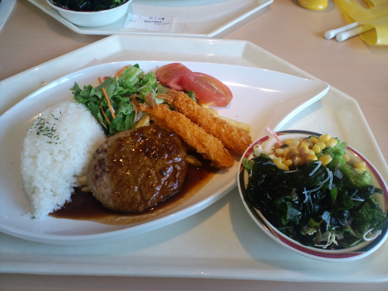 今回は2人で「ハンバーグ&エビフライプレート」(1250円)と「ハンバーグ&チキン」(1350円)を注文しました。