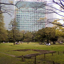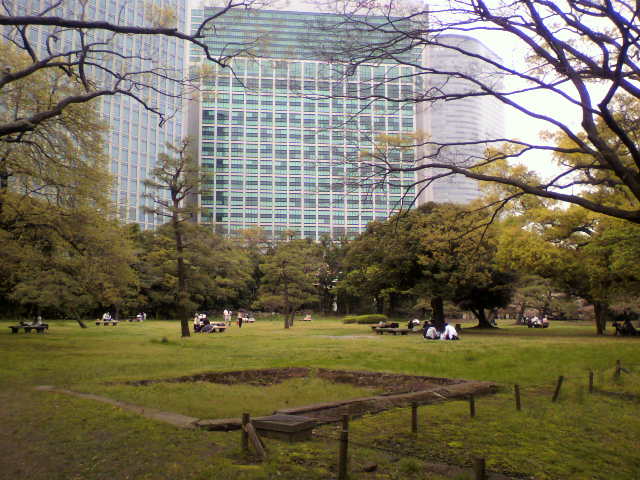 中央区にある都立の庭園、浜離宮恩賜庭園内、中の御門の入り口から入ると、右側に桜の木が並んでいるんだけど、その奥、鴨場までのあいだに広がっている広場です。