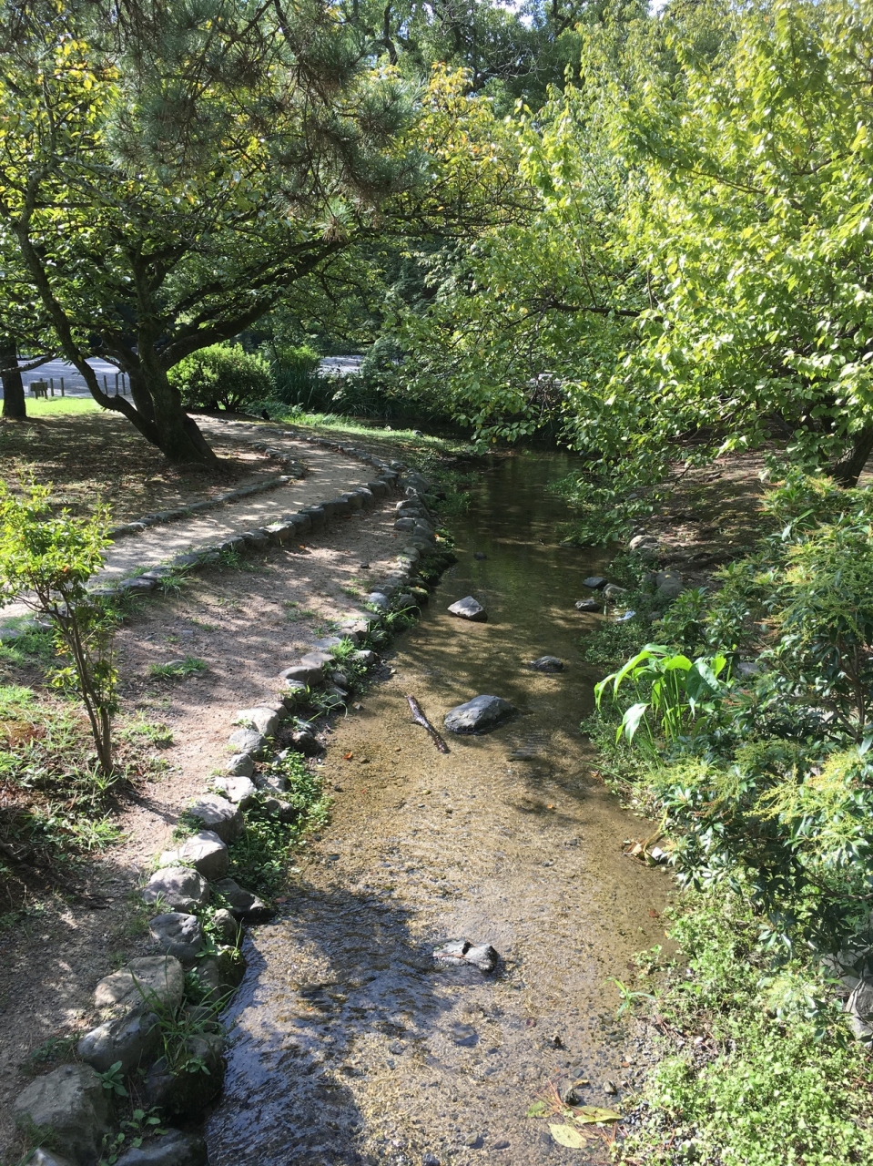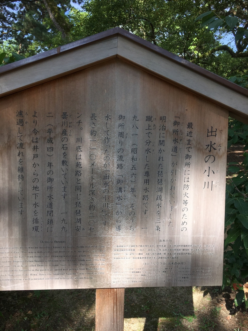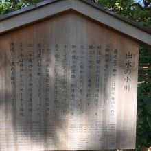 京都御所の西側にある親水公園のようなところで、近所の保育園の子供が遊んでいたりします。元々は防火のための御所水道が引かれてあり、琵琶湖疎水を三条蹴上で分水した専用水路で、御所周りの流路から導水した作ったと、解説板がありました。今は、御所水道が閉鎖され、地下水らしいですが、単なる小川も御所では、歴史が感じられました。