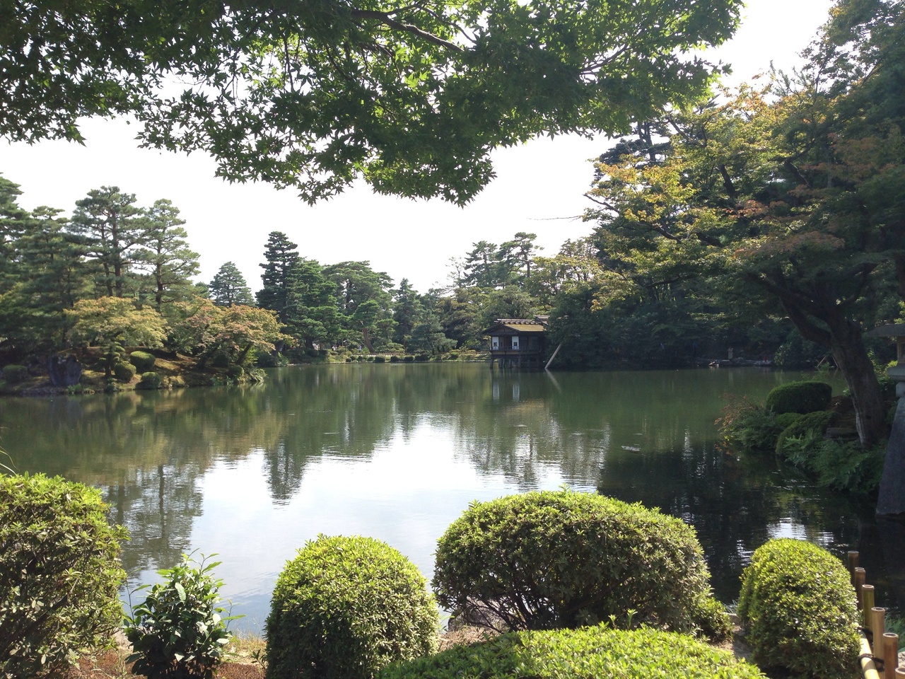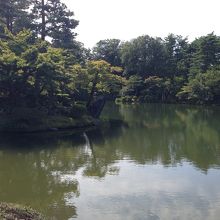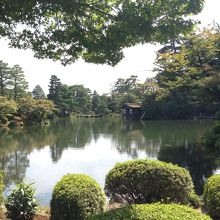 園内には 大きな池が二つあり そのうちの一つ。曲水から流れる水の終点で、兼六園の景観に欠かせない 灯籠もこの池のほとりにあります。