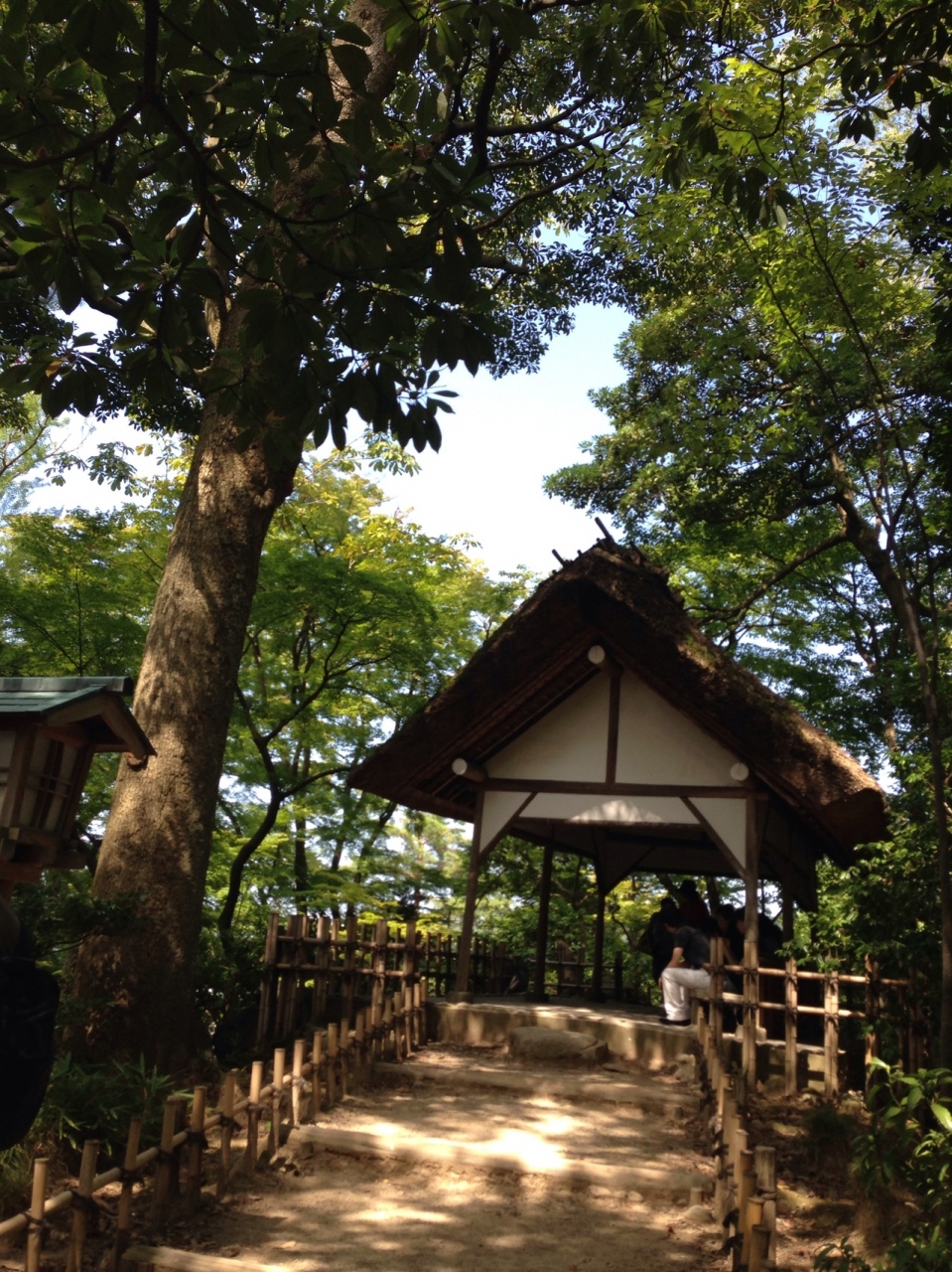 山の上には 急斜面の茅葺屋根がステキな東屋と御室の塔があります。