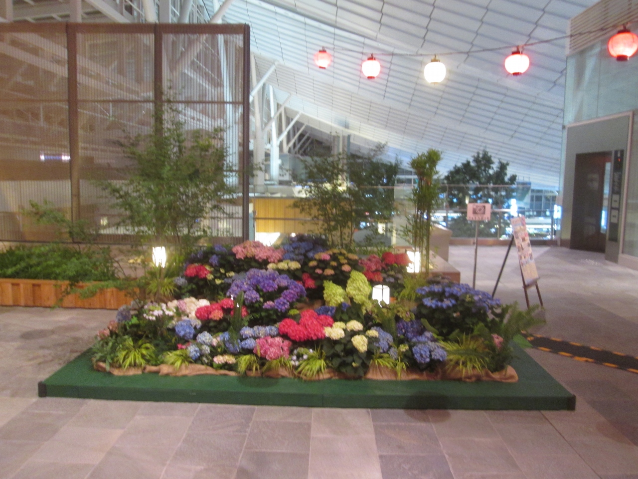5/29から6/26まであじさい装飾2016年が開催されていました。6月の季節の花である紫陽花の生花がターミナル内を彩っていました。国によっては撮影禁止のような場合がありますが、羽田はここが撮影ポイントであるマークがあり、世界各国から集まる観光客を歓迎していました。