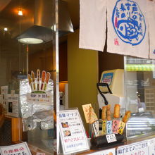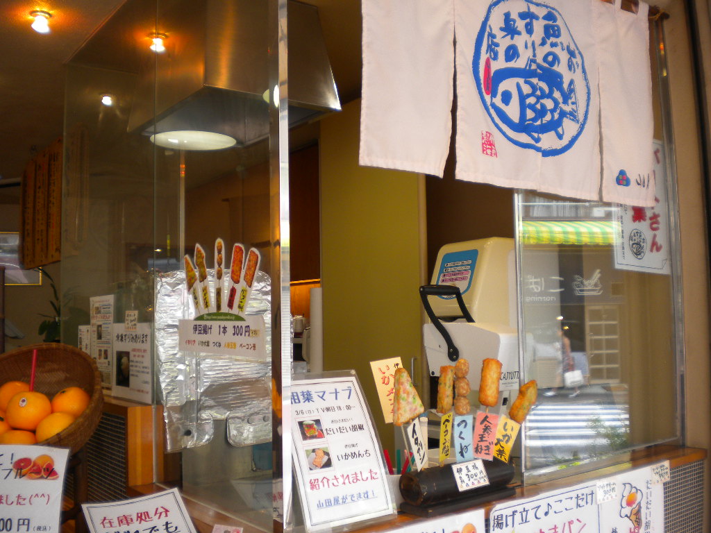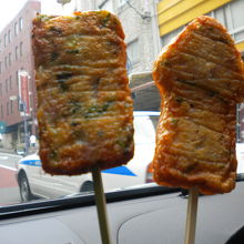 練り物屋さんで伊豆揚げ戸いうそうです、さつま揚げですね揚げたてを串に刺して食べられます、1本300円はちょっと高めに感じますが旅行中なら気になりませんね、美味しかったです。